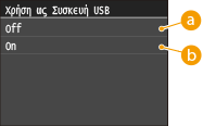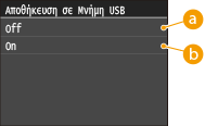 Απενεργοποιεί τη λειτουργία ανάγνωσης δεδομένων από συσκευή μνήμης USB. Δεν είναι δυνατή η εκτύπωση δεδομένων από συσκευή μνήμης USB.