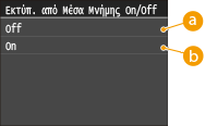Πατήστε <Εκτύπωση από Μέσα Μνήμης On/Off>.