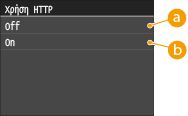 Το HTTP χρησιμοποιείται για την επικοινωνία μέσω δικτύου, όπως όταν έχετε πρόσβαση στο μηχάνημα μέσω του Remote UI (Απομακρυσμένο περιβάλλον εργασίας). Εάν χρησιμοποιείτε σύνδεση USB ή δεν χρησιμοποιείτε το HTTP, μπορείτε να απενεργοποιήσετε το HTTP για να αποτρέψετε κακόβουλες εισβολές τρίτων μέσω της αχρησιμοποίητης θύρας HTTP.
