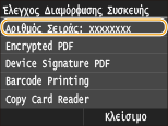 ( ) και έπειτα πατήστε <Έλεγχος Διαμόρφωσης Συσκευής>.![]() Έλεγχος του σειριακού αριθμού από τον πίνακα λειτουργίας