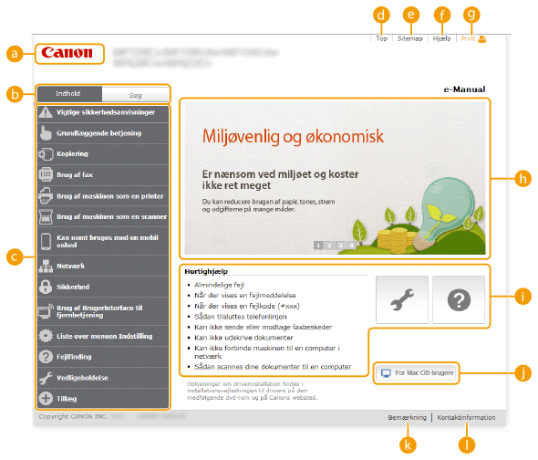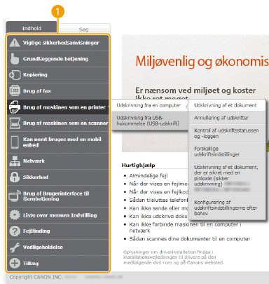 Viser indholdsfortegnelsen for e-Manual.