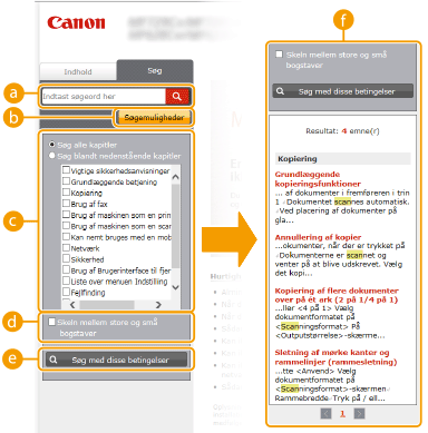 Viser resultatet af søgningen med de sider, der indeholder de angivne søgeord. I resultaterne kan du finde den side, du leder efter, og klikke på sidens emnetitel. Hvis resultatet ikke kan vises på én side, skal du klikke på
