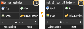 , vises en skærm, hvor du kan kontrollere statussen for de dokumenter, der udskrives, sendes eller modtages, samt statussen for maskinen (resterende mængde toner i tonerpatronen osv.) og netværksindstillinger som f.eks. maskinens IP-adresse.