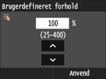 eller taltasterne til at angive kopiforholdet, og tryk på <Anvend>. Du kan angive et kopiforhold fra 25 % til 400 % i intervaller på 1 %.