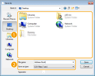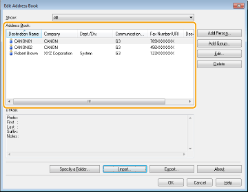 Oplysninger i adressebogen i CSV-format, der er oprettet i andre programmer såsom Microsoft Excel, kan importeres til maskinen, eller oplysningerne i adressebogen kan eksporteres til en fil, som kan bruges på andre faxmaskiner eller i andre programmer. Maskinen understøtter to filformater: CSV-filer (*.csv) og Canon Address Book-filer (*.abk).