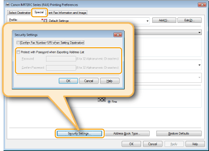 Hvis du har valgt [Protect with Password when Exporting Address List] (Beskyt med adgangskode ved eksport af adresseliste) i dialogboksen, der vises, når der klikkes på [Security Settings] (Sikkerhedsindstillinger) på fanen [Special] (Speciel), vises en dialogboks til indtastning af en adgangskode, når du klikker på [Export] (Eksportér). Klik på [Help] (Hjælp) på skærmen for printerdriveren for at få flere oplysninger.