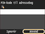 Hvis der er indstillet en pinkode for adressebogen, vises <PIN-kode til adressebog>-skærmen under import. Indtast pinkoden for adressebogen, og tryk på <Anvend>. Tryk på <Ignorér> for at annullere import af adressebogsdata.