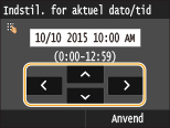 Angiv <Tidszone>, før du angiver den aktuelle dato og det aktuelle klokkeslæt. Hvis indstillingen <Tidszone> ændres, skifter den aktuelle dato og det aktuelle klokkeslæt tilsvarende.