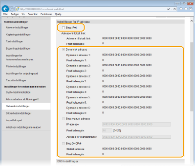 IPv6-adresserne på maskinen kan konfigureres via Brugerinterface til fjernbetjening. Før du indstiller IPv6-adresserne, skal du kontrollere IPv4-adresseindstillingerne (Visning af IPv4-indstillinger). Du skal angive de korrekte IPv4-indstillinger for at bruge IPv6-adresser. Bemærk, at scanningsfunktionen, der anvender scannerdriveren eller MF Scan Utility, ikke er tilgængelig i et IPv6-miljø. Maskinen kan anvende op til ni af følgende IPv6-adresser: