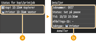 ![]() <Status for kopi/printjob>Viser en liste over de dokumenter, der behandles, kopieres eller venter på at blive behandlet.