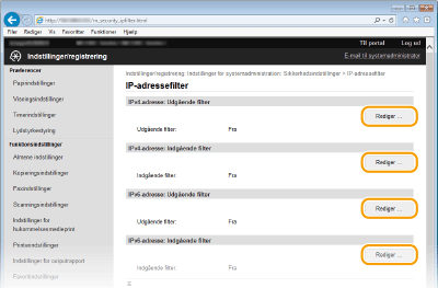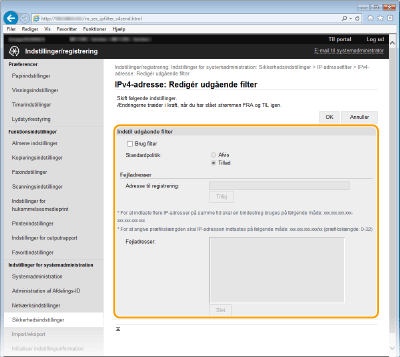 Hvis IP-adresserne er indtastet forkert, kan du muligvis ikke få adgang til maskinen fra Brugerinterface til fjernbetjening. I dette tilfælde skal du angive <IPv4-adressefilter> eller <IPv6-adressefilter> til <Fra>. IPv4-adressefilter IPv6-adressefilter