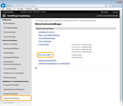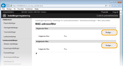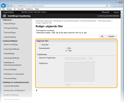 Hvis MAC-adresserne er indtastet forkert, kan du muligvis ikke få adgang til maskinen fra Brugerinterface til fjernbetjening. I dette tilfælde skal du angive <MAC-adressefilter> til <Fra>. MAC-adressefilter