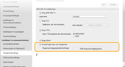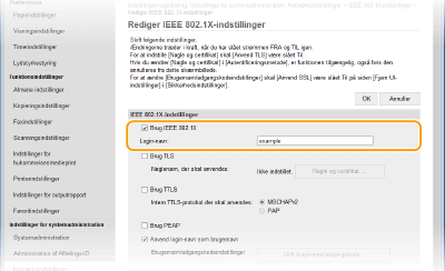 Marker afkrydsningsfeltet [Brug IEEE 802.1X], angiv logonavnet i tekstfeltet [Login-navn], og angiv de krævede indstillinger.