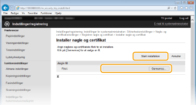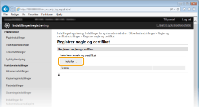 Klik på [Nøgle- og certifikatindstillinger] for at installere et nøglepar eller [CA-certifikatindstillinger] for at installere et CA-certifikat.