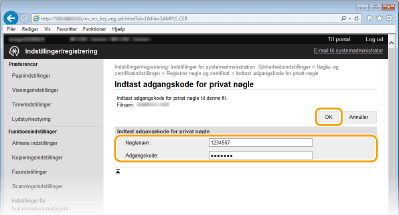 Angiv navnet på nøgleparret og adgangskoden, og klik derefter på [OK].