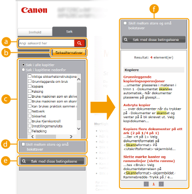 Viser søkeresultatene for sidene som inneholder de angitte nøkkelordene. Fra resultatene kan du finne siden du søker etter, og klikke emnetittelen på siden. Hvis resultatene ikke kan vises på én side, klikker du på
