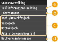 , vises et skjermbilde som lar deg sjekke fremdriften for dokumenter som skrives ut, sendes eller mottas, samt statusen til maskinen (gjenværende toner osv.) og nettverksinnstillingene som for eksempel maskinens IP-adresse.