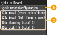 ) vises <Sjekk telleverk>-skjermen. Fra dette skjermbildet kan du vise televerdier for utskrifter i tillegg til serienummeret på maskinen og maskinkonfigurasjonen.