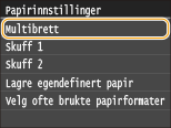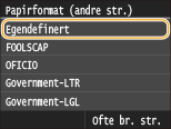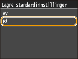 Etter at den standard papirinnstillingen er registrert, vises ikke papirinnstillingsskjermbildet når papir er lagt inn, og den samme innstillingen brukes alltid. Hvis du legger inn et annet papirformat eller -type uten å endre papirinnstillingene, kan det hende at maskinen ikke skriver ut riktig. For å unngå dette problemet deaktiverer du standardinnstillingen ved å velge <Av> i trinn 3, og deretter legger du inn papiret.