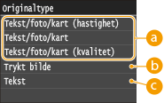 Du kan velge den optiske bildekvaliteten for kopien avhengig av dokumenttypen, for eksempel dokumenter med bare tekst, dokumenter med diagrammer og grafer eller fotoer fra ukeblader.