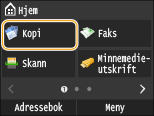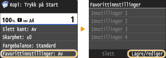 Du kan registrere opptil fire ofte brukte kombinasjoner av kopiinnstillinger. Ved ganske enkelt å velge en registrert innstillingskombinasjon ved behov kan du eliminere behovet for å konfigurere de samme innstillingene hver gang du lager kopier, for eksempel hvis du ofte angir antall kopier til 5, angir <Slett kant> til <På> og øker skarpheten når du kopierer. Du kan også vise skjerminnstillinger som snarveistaster på <Hjem>-skjermen.