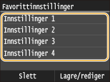 Hvis du vil slette en registrert innstilling, trykk på <Kopi>  <Favorittinnstillinger>  <Slett>  Velg innstillingene  <Ja>  <Ja>.