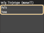 Følg prosedyren under for å stille inn type telefonlinje. Dersom du ikke er sikker på type telefonlinje du bruker, kontakter du telefonselskapet ditt. <Velg linjetype> er kanskje ikke tilgjengelig, avhengig av hvilket land du bruker maskinen i.