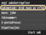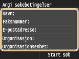 Navn, faksnumre, e-postadresser, organisasjonsnavn og organisasjonsenheter er kriterier som er tilgjengelige for søk av mottakere. Flere søkekriterier kan spesifisere på samme tid.