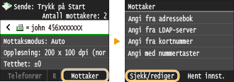 Maksimalt antall mottakere du kan angi med talltastene i kombinasjon med en LDAP-server, er 10. Hvis for eksempel 7 mottakere er angitt ved å bruke talltastene, kan opptil 3 mottakere angis ved å bruke en LDAP-server.