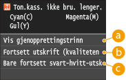 Hvis meldingen <Klargjør svart tonerkassett.> vises når maskinen mottar en faks, eller hvis automatisk rapportutskrift er angitt, lagres mottatte fakser og rapporter på maskinen, slik at utskriften ikke blir falmet. Hvis du vil unngå utskrifter som er uklare eller falmede, setter du <Forts. utskrift. Når lite ton.> til <Av>. Fortsett utskrift når det er lite toner
