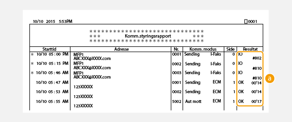Når en feilkode vises). For e-post viser kommunikasjonsstyringsrapporter senderesultatet mellom maskinen og e-postserveren, ikke mellom maskinen og mottakeradressen.