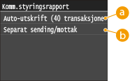 Du kan kontrollere faks- og e-postloggene over sendte og mottatte dokumenter ved å skrive ut en kommunikasjonsstyringsrapport. Rapporten kan skrives ut automatisk etter hver 40. sending, eller du kan skrive den ut manuelt.