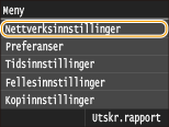 Alle innstillingene om nettverket er oppført med korte beskrivelser. Standardinnstillinger er merket med en dolk (