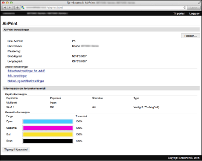 Du kan vise skjermbildet for AirPrint, hvor du ikke bare har tilgang til AirPrint-innstillingene, men også kan se informasjon om forbruksvarer, som papir og toner. I tillegg kan du konfigurere innstillinger for sikkerhetsfunksjoner (