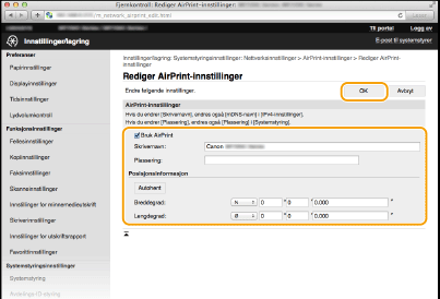 Angi navnet og installasjonsstedet for å få hjelp til å identifisere denne maskinen når du bruker Apple-enheten. Denne informasjonen er nyttig hvis du har mer enn én AirPrint-skriver.