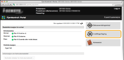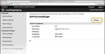 Du kan registrere informasjon, inkludert navnet på maskinen og installasjonsstedet, som brukes for å identifisere maskinen. Du kan også deaktivere AirPrint-funksjonen til maskinen. Bruk Fjernkontroll til å endre disse innstillingene.