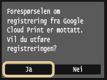 Du kan også registrere maskinen fra en mobilenhet eller Google Chrome. Maskinens skjerm viser følgende bekreftelsesskjermbilde før registreringen fullføres. Trykk på <Ja> for å fullføre registreringen.