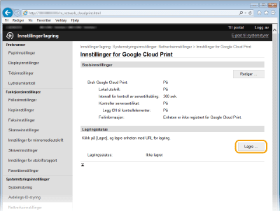 Du må aktivere Google Cloud Print. Klikk på [Rediger], merk av for [Google Cloudprinter gebruiken] og klikk på [OK].
