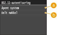 Når du kobler til et trådløst LAN, oppstår det en godkjenningsfeil på maskinen hvis godkjenningen av den delte nøkkelen er angitt på den trådløse ruteren. Hvis dette skjer, endrer maskinen automatisk innstillingen til <Delt nøkkel> og prøver tilkoblingen på nytt.