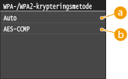 ![]() <Auto>Angir at maskinen automatisk velger AES-CCMP eller TKIP for å samsvare med innstillingen på den trådløse ruteren.