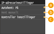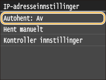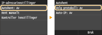 ![]() Hvis <På> vises, trykker du på <Autohent> og angir både <Velg protokoll> og <Auto-IP> til <Av>.
