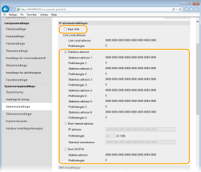 En adresse som angis manuelt. Når du skal bruke denne adressen, må du angi prefikslengde og standard ruteradresse.