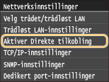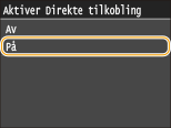 Ved å angi <Aktiver Direkte tilkobling> til <På> hindres bruk av kablet LAN eller andre trådløse LAN enn direkte tilkobling.
