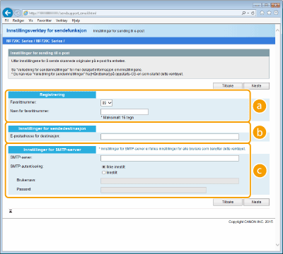 Du kan angi mer detaljerte innstillinger ved å bruke Fjernkontroll i stedet for Innstillingsverktøy for sendefunksjon (Konfigurere kommunikasjonsinnstillinger for e-post/I-faks). Innstillingsverktøy for sendefunksjon er nyttig for brukere som ønsker enkelt oppsett.