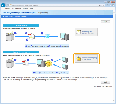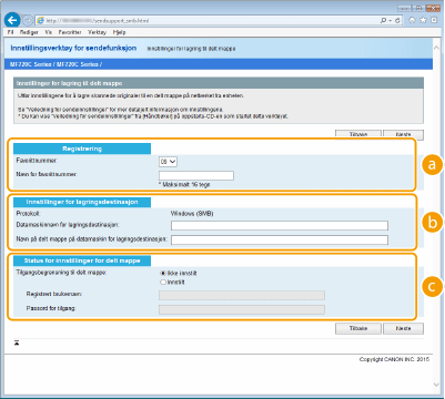 Konfigurere SMB ). Hvis du vil konfigurere maskinen for å lagre skannede dokumenter i en delt mappe på nettverket via SMB, angir du plasseringen for den delte mappen fra en datamaskin ved å bruke Innstillingsverktøy for sendefunksjon.