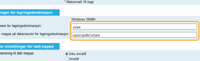 Angi navnet på (eller banen til) den delte mappen. Hvis den delte mappen for eksempel er en undermappe med navnet "delt" og befinner seg i mappen [Public] (Felles) på stasjon C (bane: C:\users\public\share), angir du "users\public\share".