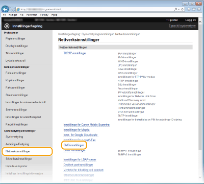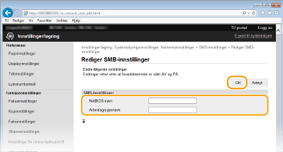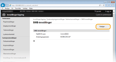 Server Message Block (SMB) er en protokoll for deling av ressurser, for eksempel filer og skrivere, med flere enheter på et nettverk. Maskinen bruker SMB til å lagre skannede dokumenter i en delt mappe. Alt etter hvilket nettverk du bruker, må du kanskje angi NetBIOS-navnet og navnet på arbeidsgruppen.