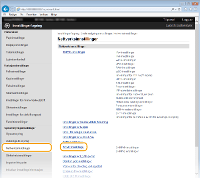 Hvis begge versjoner av SNMP er aktivert, anbefales det at MIB-tilgangstillatelsen i SNMPv1 angis til [Kun lese]. MIB-tilgangstillatelsen kan angis uavhengig i SNMPv1 og SNMPv3 (og for hver bruker i SNMPv3). Ved å velge [Lese/skrive] (full tilgangstillatelse) i SNMPv1 oppheves de robuste sikkerhetsfunksjonene som er et kjennetegn i SNMPv3, fordi de fleste av maskininnstillingene dermed kan kontrolleres med SNMPv1.