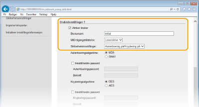 Hvis du vil angi eller endre passordet, merker du av i boksen og taster inn fra 6 til 16 alfanumeriske tegn for passordet i tekstboksen [Autentiseringspassord] eller [Krypteringspassord]. Tast inn det samme passordet i tekstboksen [Bekreft] for bekreftelse. Passord kan angis separat for godkjennings- og krypteringsalgoritmen.