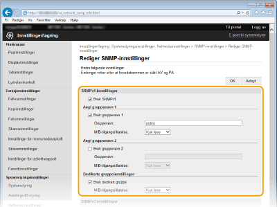 For hver gruppe velger du [Lese/skrive] eller [Kun lese] for tilgangsrettigheter til MIB-objekter.